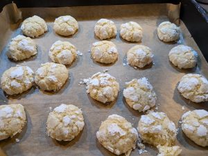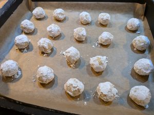 Riprendete il composto e formate delle palline da 20 gr. Passatele prima nello zucchero semolato e poi nello zucchero a velo. Riponetele ben distanziate su una teglia rivestita di carta forno ed infornate a 180°C per 15 minuti.