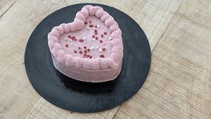 Nel frattempo montate 5 minuti la namelaka al lampone, dopo il lungo riposo. Otterrete una crema vellutata e cremosa. Usatela quindi per stuccare il vostro cake. Con una sac a poche e una bocchetta dentata decorate il top della torta. Io ho aggiunto delle codette a forma di cuore.