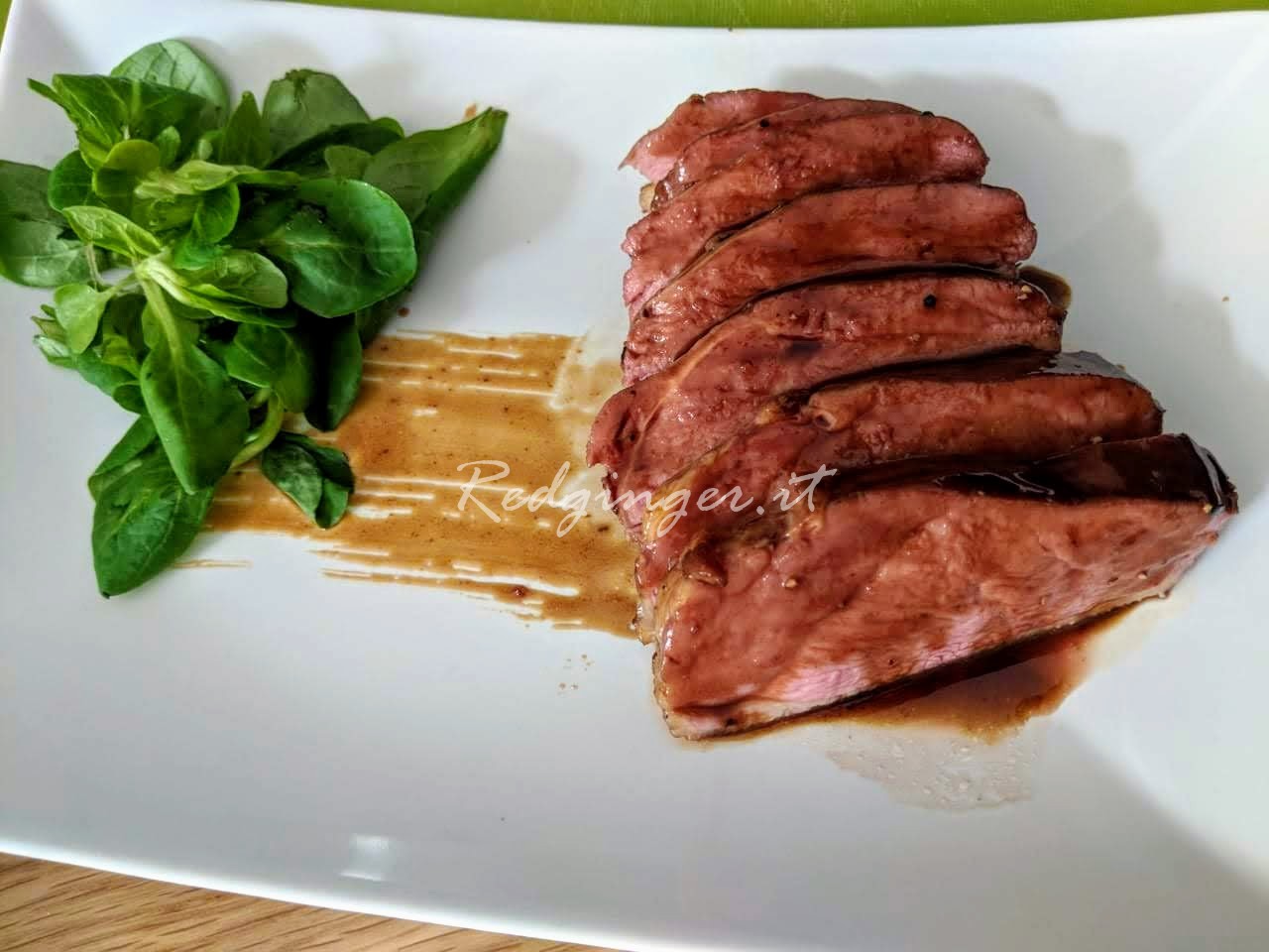 Tagliate il petto d’anatra a fette, spennellate il piatto e le fette d’anatra con la salsa. Accompagnate con del soncino per dare freschezza al piatto.