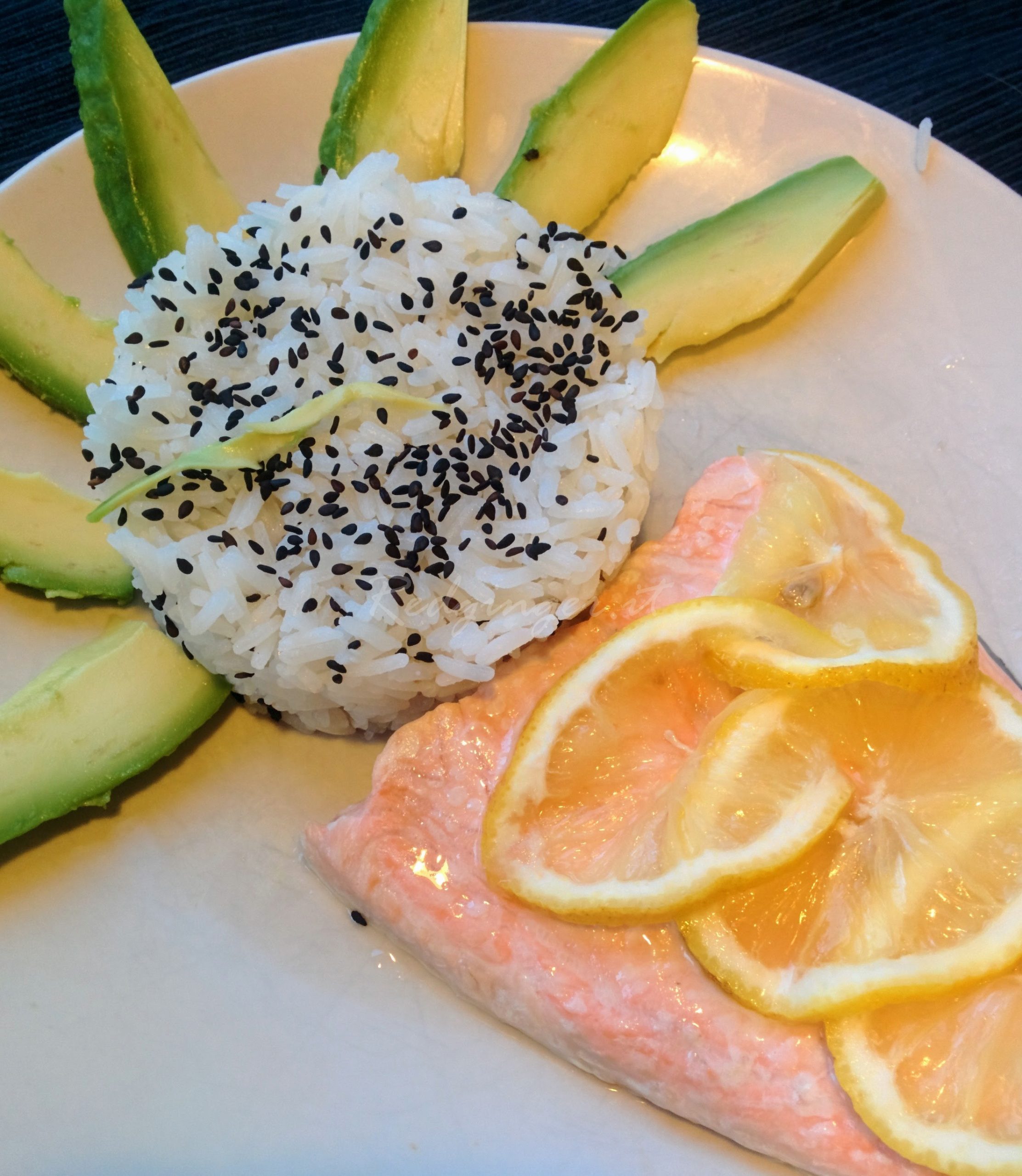 Intanto preparare il salmone: tagliate il limone a fette sottilissime e coprite i tranci prima con il limone poi con l’aneto in polvere. Lasciate cucinare 10 minuti dal momento di bollitura dell’acqua. Io uso la vaporiera che è più comoda, ma potete usare anche i cestelli per la cottura a vapore. Servite il salmone caldo con il riso basmati coperto di semi di papavero e l’avocado a fette.